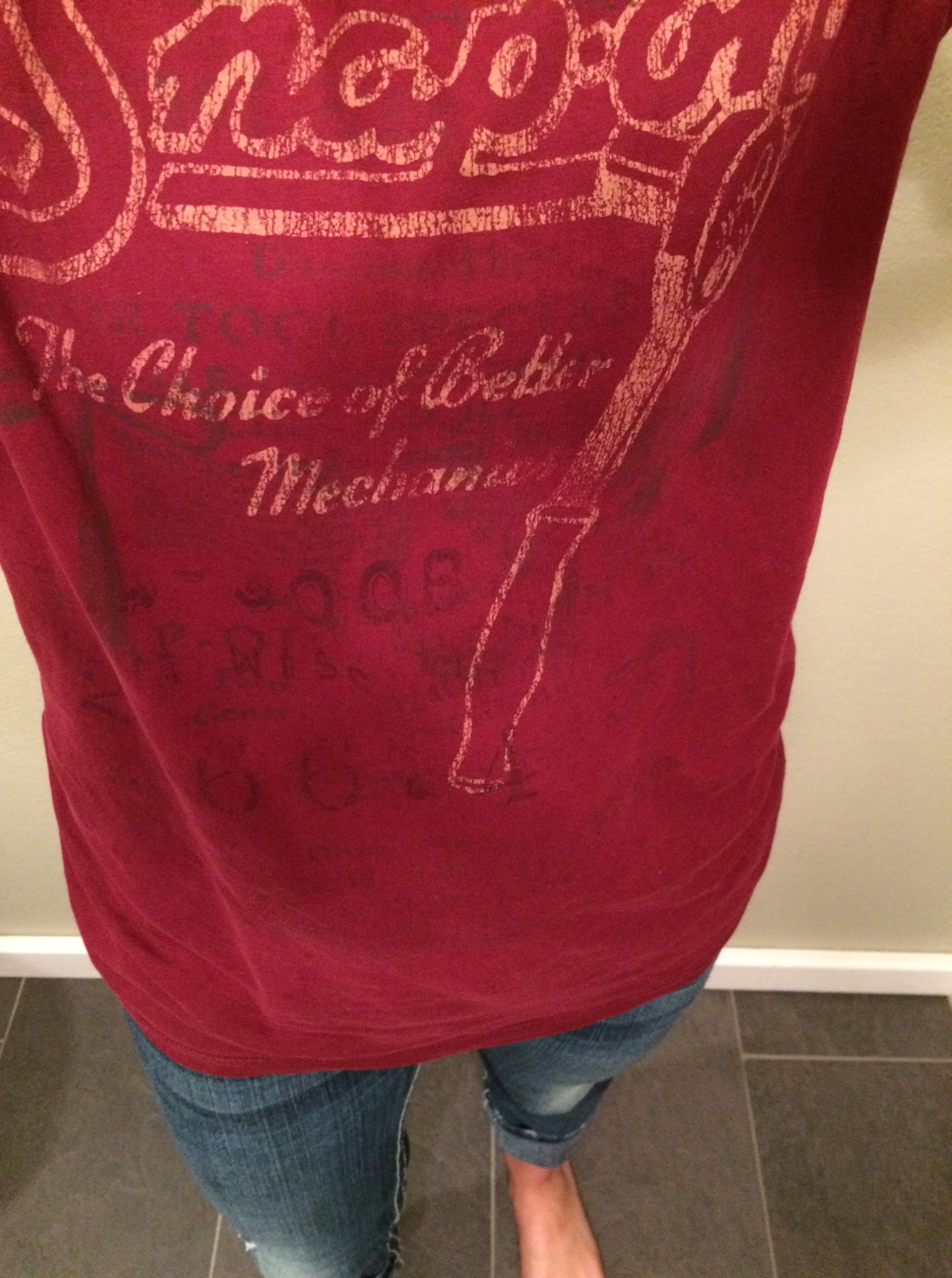 It has also made me consider how worn my fourteen items will probably be at the end of the month. Most of us don’t really know what worn out clothes looks or feels like these days. We don’t live in the world of my grandparents where you took your husbands dress shirts and detached the collar, flipped it the other way so it didn’t show the wear…and because there wasn’t money for a new shirt. Most of us don’t know what its like to HAVE to wear a pair of shoes that are worn through the soles. Some of us may have never worn a piece of clothing as dirty as what my Snap-on shirt is right now. Bless our hearts.