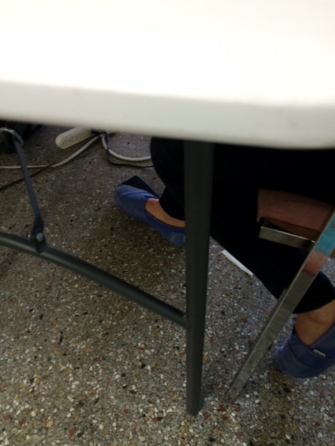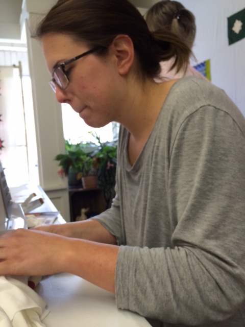 This was basically my face the whole time I am sewing….I’M ALMOST DONE! (My head looks weird because there was a lady right behind me looking at a quilt. This photo is credited to Lyla.)