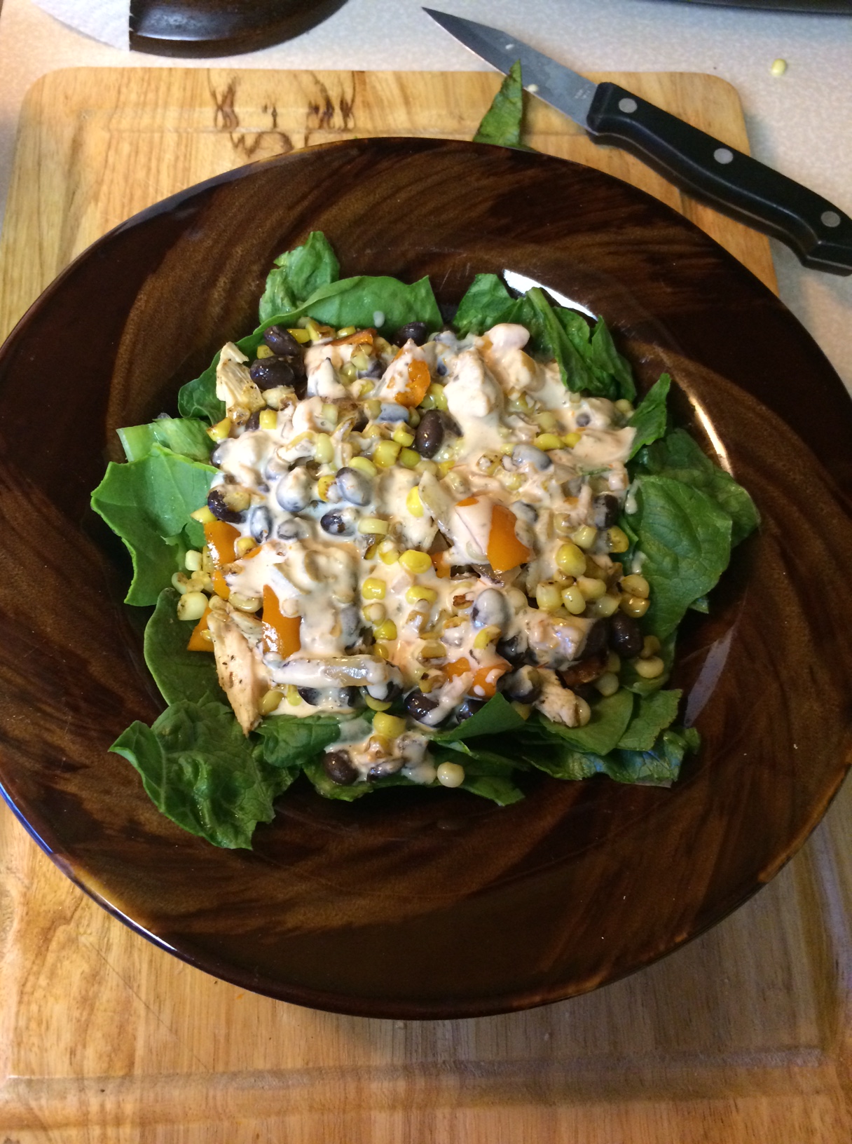 In saute pan heat olive oil on medium high heat. Add onions, peppers and a sprinkle of fajita seasoning. Allow veggies to cook at least 1-2 minutes before turning. The OIL WILL BE HOT, be careful. After 4 minutes add corn, cook another 2-4 minutes until veggies and corn appear “roasted”. Turn off heat, add black beans, chicken seasoned with salt, generous pepper and fajita seasoning, cover. Let this all sit on the stove for at least 5 minutes so that the beans and chicken are warm. Stir and then add on top of salad. You will want to immediately add dressing and serve.