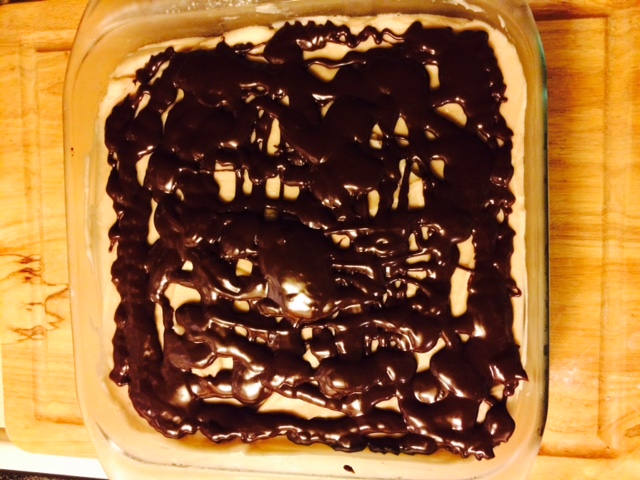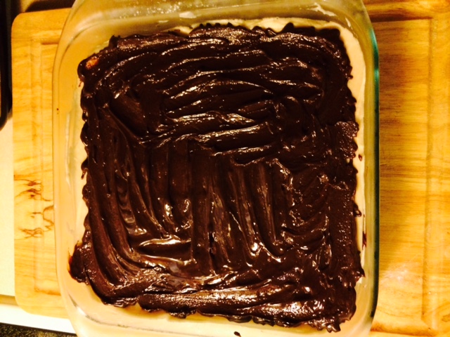 I started doubting the glaze as soon as I realized these suckers were going to be so thick…I knew that the glaze was meant to be the darkest, least sweet and most bitter part of the dessert and I guess it was also probably supposed to be the thinnest layer. So I winged it again, and sort of cut it into 1/3 and made a smaller batch. I was unsure of the consistency though. I don’t know if it was the change of cooler weather but the glaze seemed awfully thick to me. So I did not let it go to room temperature. I just let it cool for a few minutes, drizzled it on, and then smoothed it out. I was afraid of the cream cheese and glaze mixing and so I didn’t smooth it too much. After the glaze, I put it in the freezer for another 5-10.