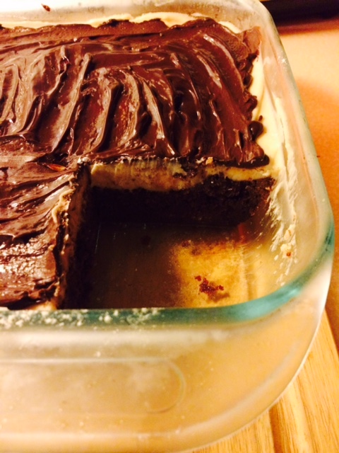 During the brownie layer, adding the eggs one at a time is very important. I got side tracked while talking on the phone and accidentally added two at one time and it took a lot of extra whisking. Also, another important note I cannot forget is that you need to be extremely cautious with your bowl while melting the chocolate…if you have a metal bowl, please use it! If not, you need to be careful about not getting your water too hot because you will shatter a glass bowl if you do. Also I left out the walnuts. Because of my nut allergy this was a no brainer. But I don’t think you will miss them even if you are a nut person. Can we talk about the espresso powder for a second? Whenever I saw that on the ingredient list, I immediately thought, “Is this a real thing? This is a cheat/cheap thing right? Isn’t real espresso a must?!” Any who, I was totally won over with the final product and the ease of not needing an espresso machine. Lastly, I obviously was scared about the cooking time with mine being in a smaller pan, but I cooked mine for 27-30 minutes and the edges were not burned and the middle finished cooking in the cooling process.